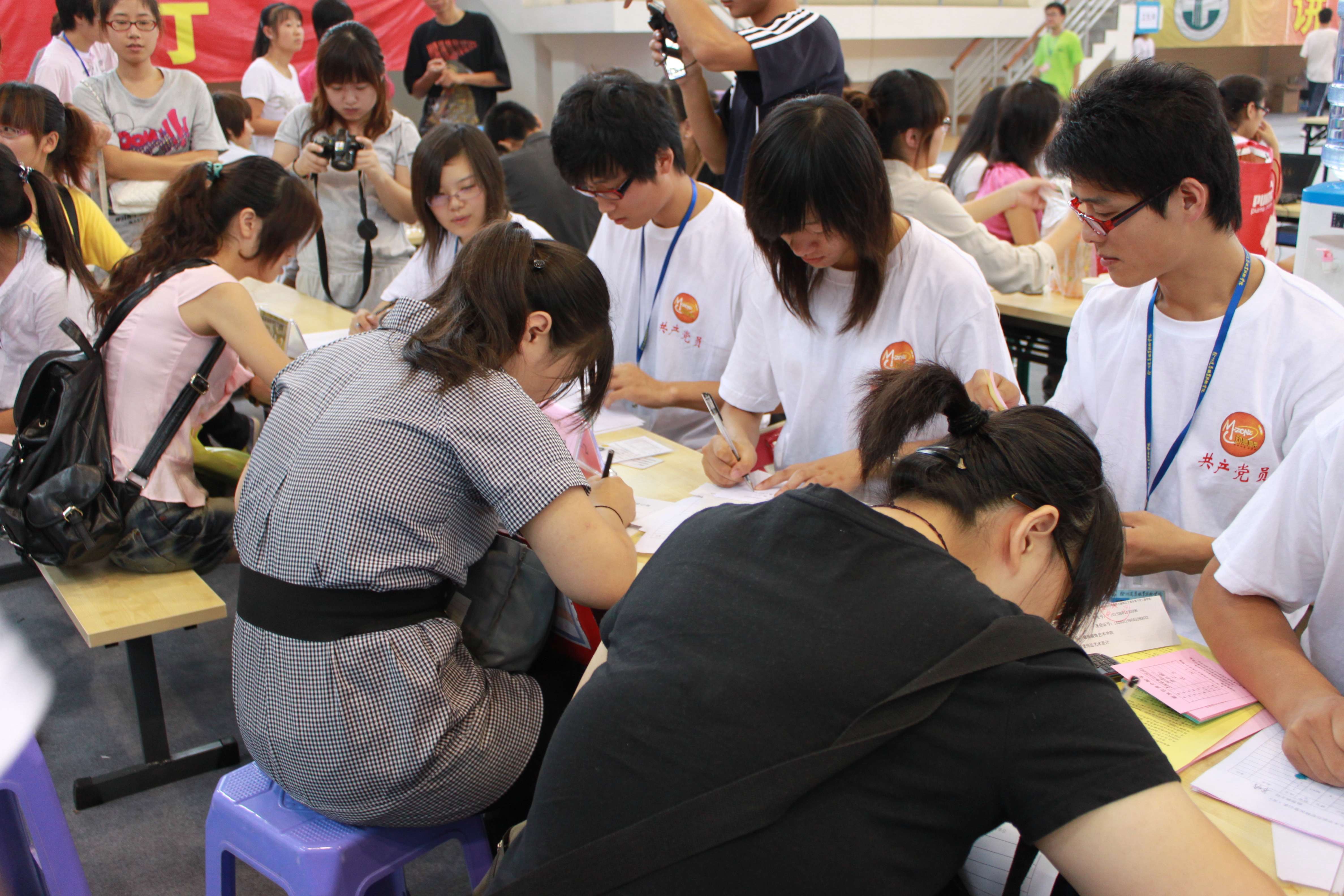新同学在报到现场填写个人信息,