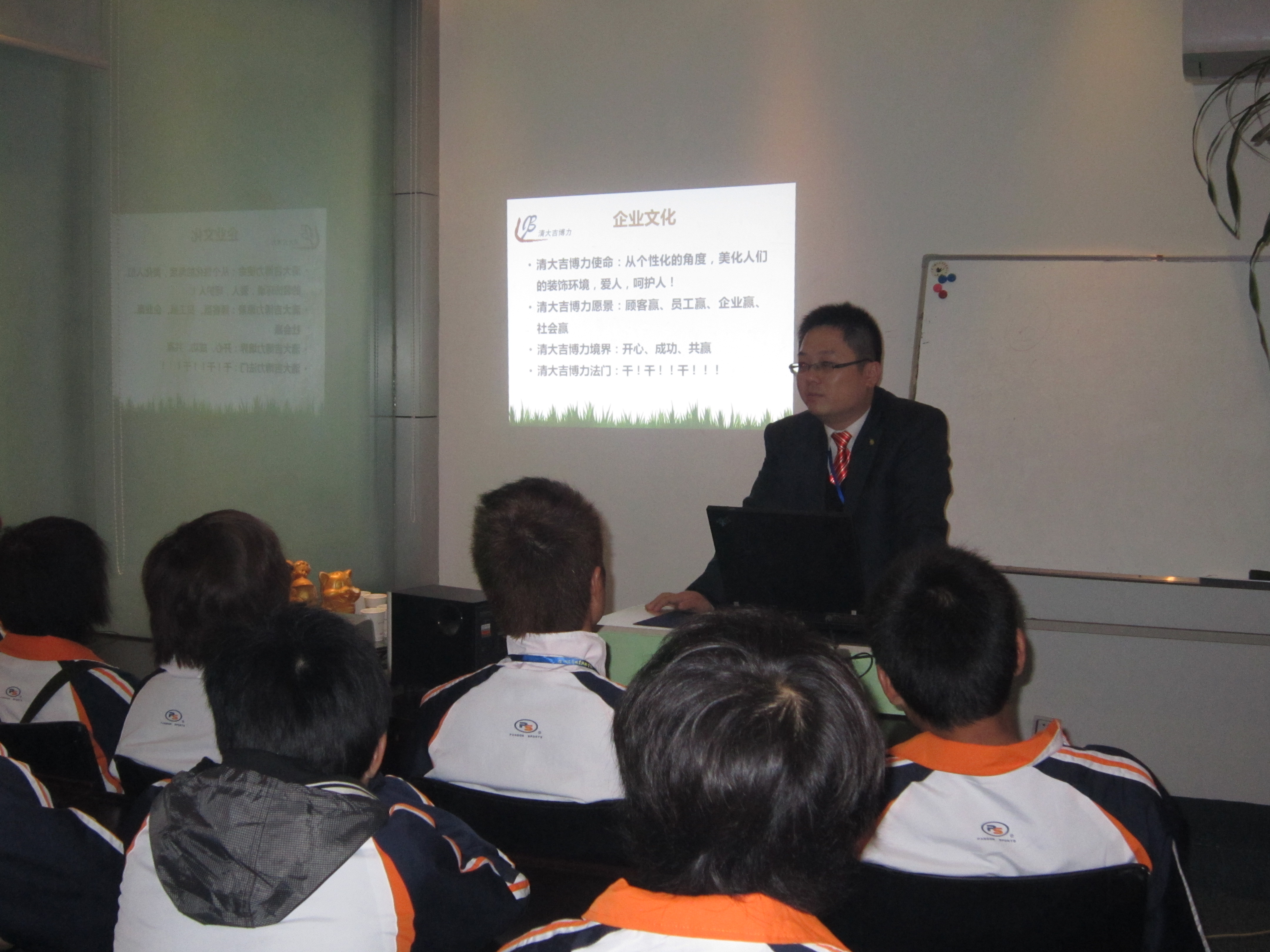 本网讯:1118上午,英国上市官网365“清大吉博力特色班”35名同学赴清大吉博力公司开始了订单培养的第一堂课。同学们在公司工作人员的引导下参观了精美的壁纸展厅,鲜亮的色彩、精美的图案、精湛的工艺吸引了同学们的眼球。通过参观展厅,特色班同学对壁纸产品本身的魅力以及专业、行业的发展有了更加直观的认识和深刻的了解。在公司的培训室,孔政经理就液体壁纸行业的历史发展、公司的企业文化、壁纸产品研的发制作等几项内容给同学们上了一堂丰富的课。