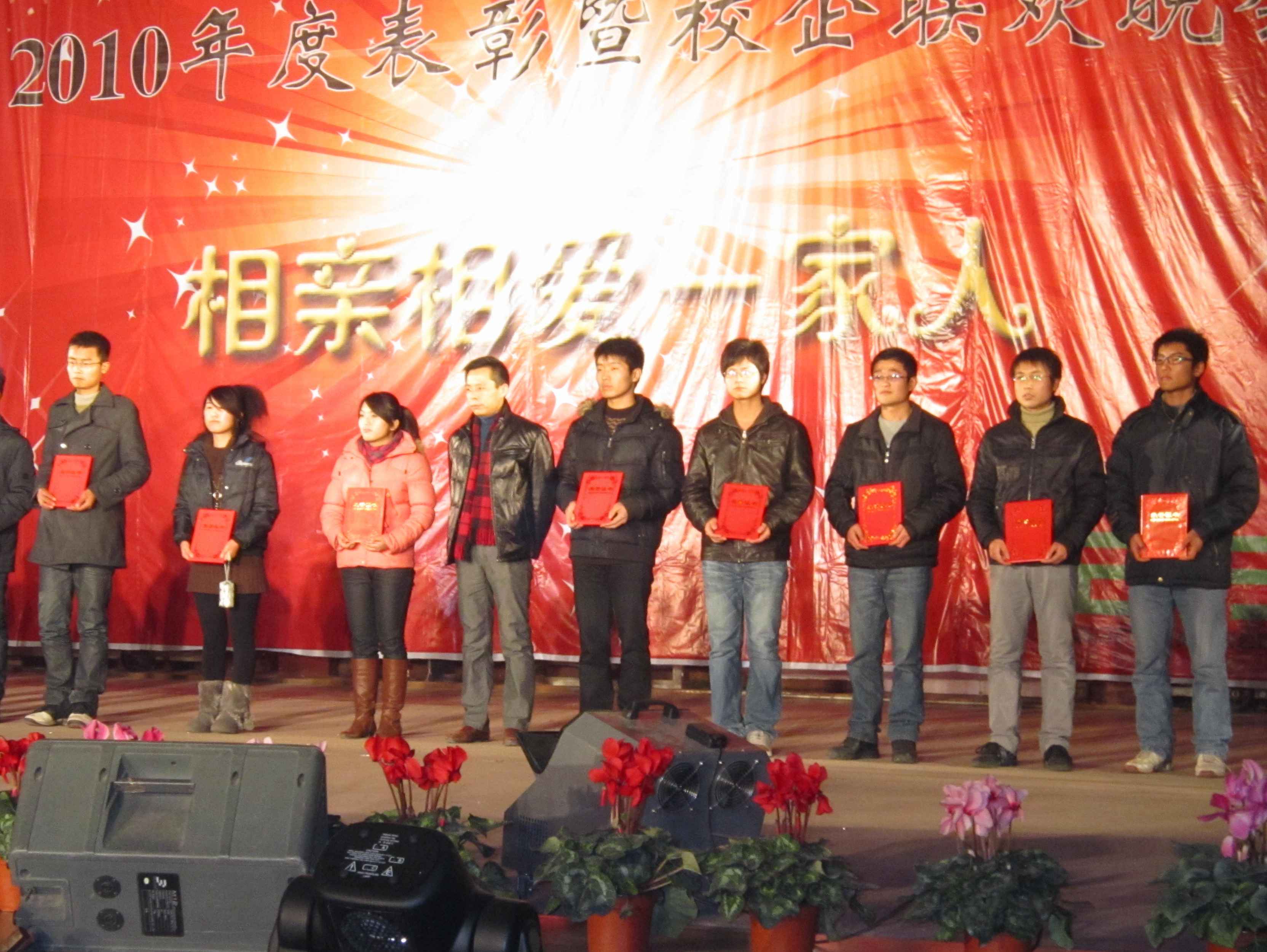 在晚会进行过程当中,穿插了英国上市官网3652010年度表彰。党总支书记梁惠和经理孙亚峰对一年来英国上市官网365举办的两期职业技能竞赛一等奖获得者进行了表彰,徐州天力建筑装饰有限公司总经理李宝珠、江苏水立方建筑装饰设计院副经理胡艳琴和上海睿合广告传播有限公司徐州分公司总经理田建龙分别为企业奖学金获得者颁发荣誉证书,徐州清大吉博力建材有限公司总经理张吉鹏为“清大吉博力”特色班的35位同学颁发了企业助学金。