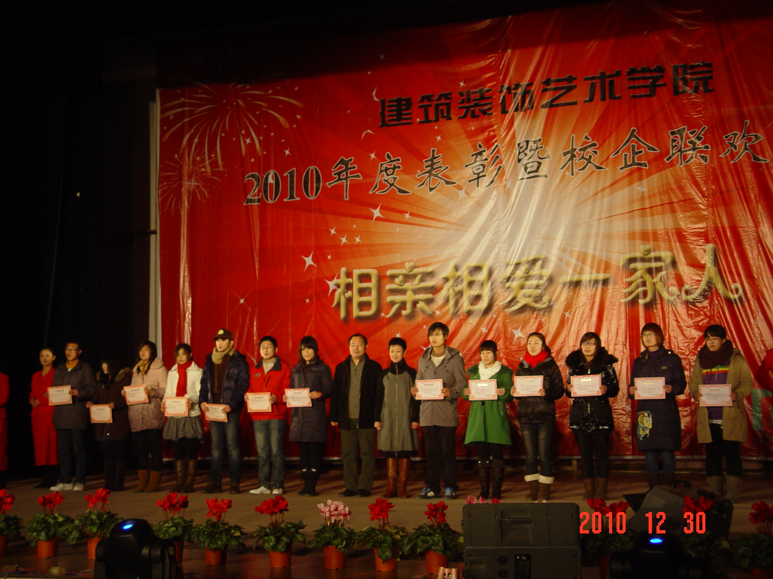 1230,建筑装饰艺术公司联手4家紧密合作企业在公司会堂隆重举办了“相亲相爱一家人”2010年度表彰暨校企联欢晚会。建筑装饰艺术公司全体师生,徐州天力建筑装饰有限公司、江苏水立方建筑装饰设计院、上海睿合广告传播有限公司、徐州清大吉博力建材有限公司4家企业的领导和员工共同参与了晚会,集团员工工作处处长丁维华、徐州移动公司铜山分公司刘秀敏经理应邀出席晚会。