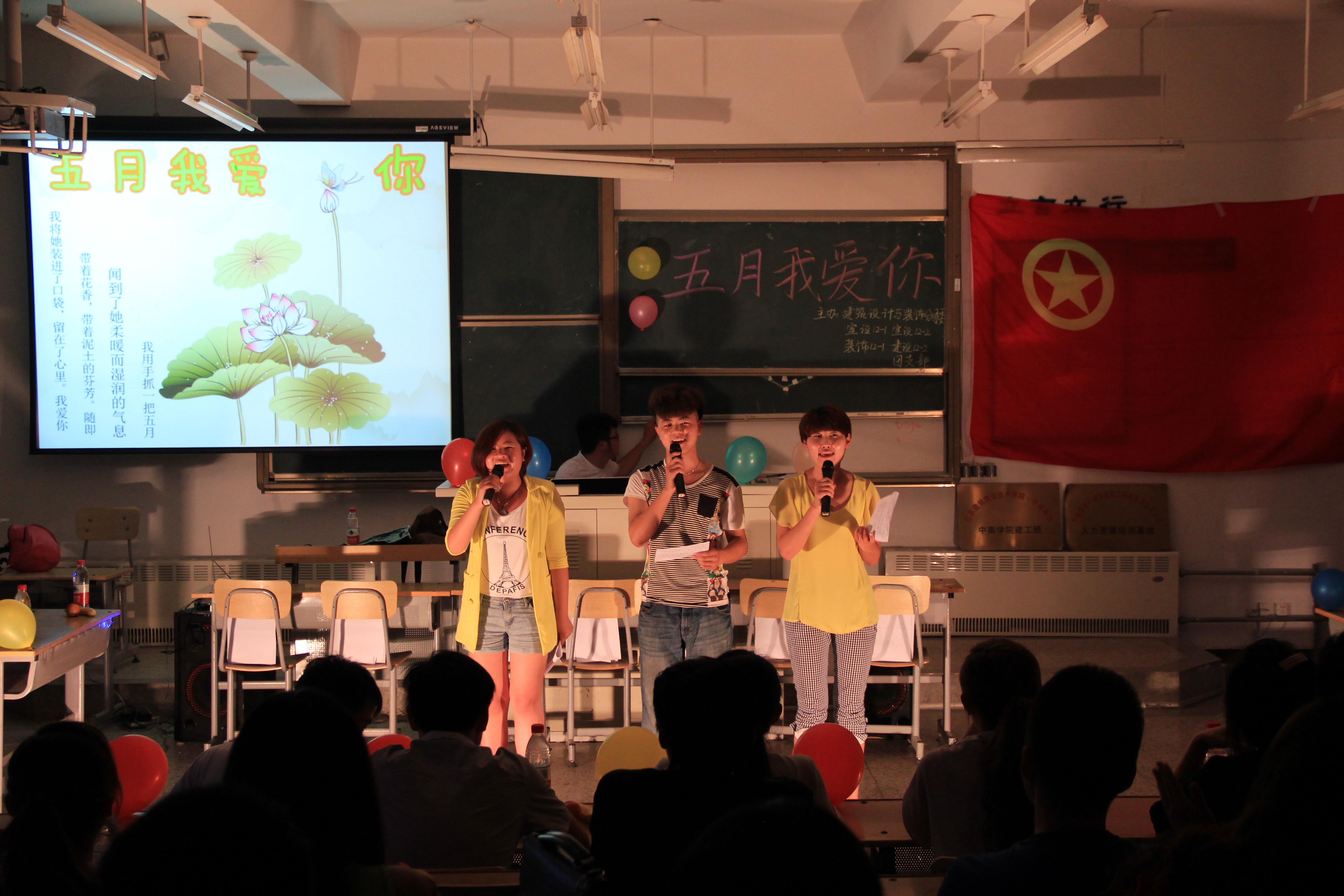 2013年5月24日晚,由室设12-1、2班,装饰12-1班,建设12-2班举办以“五月我爱你”的公开团课,团课主要流程是围绕母亲节与劳动节展开,精彩节目有:开场舞、街舞、歌曲、小品以及走秀等。