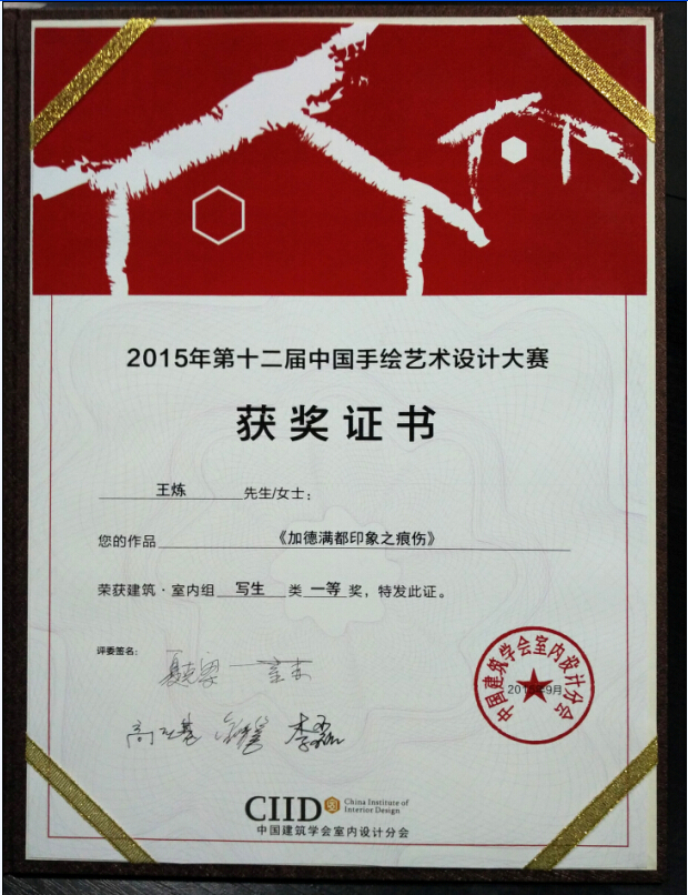 9月7日,2015年第十二届中国手绘艺术设计大赛评选结果进行揭幕,公司青年教师王炼的作品 《加德满都印象之痕伤》喜获建筑·室内组一等奖。