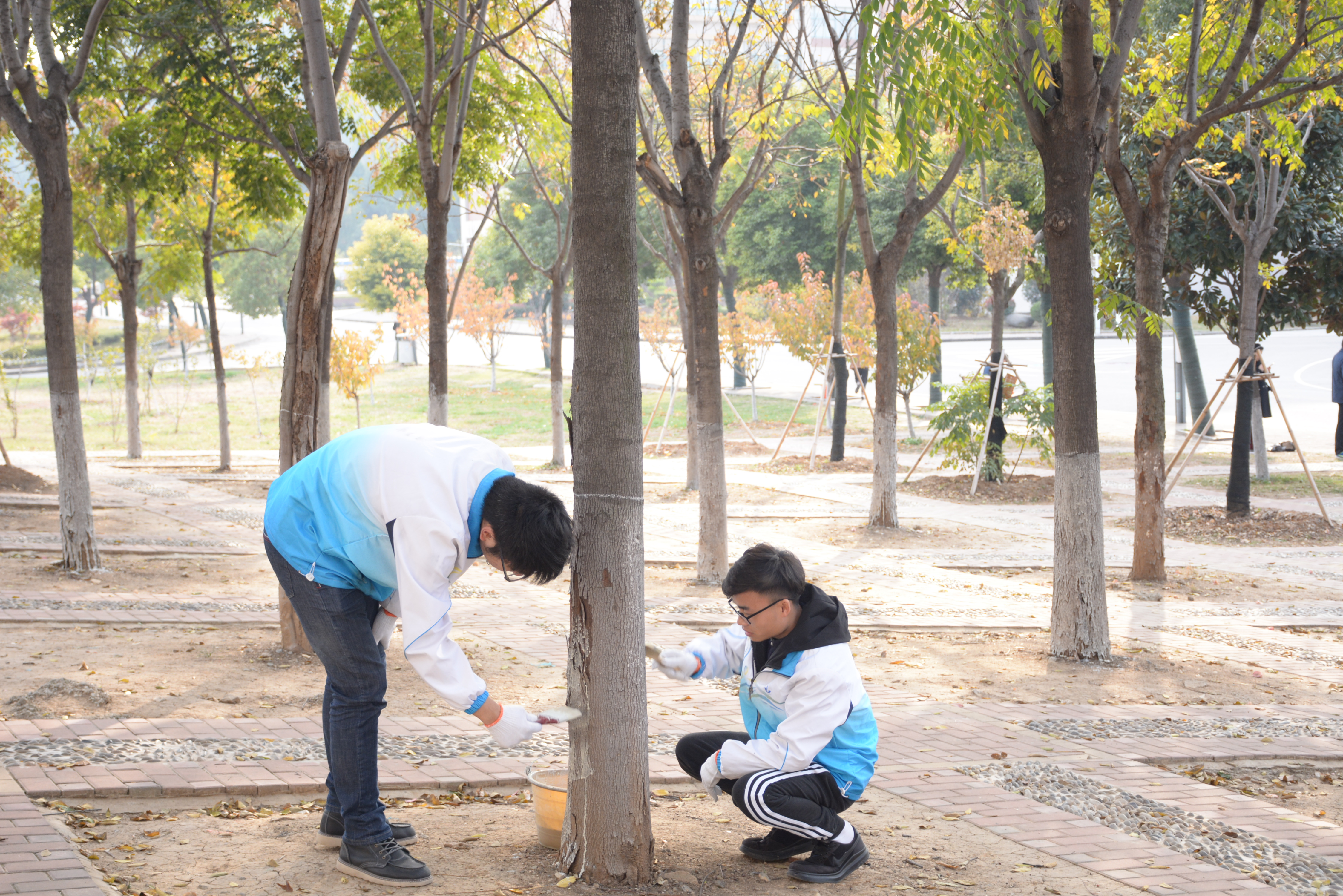 2017年11月14日下午,建筑设计与英国上市官网365园林15-1、2班同学积极参与了树木刷白的校园绿化养护工作。