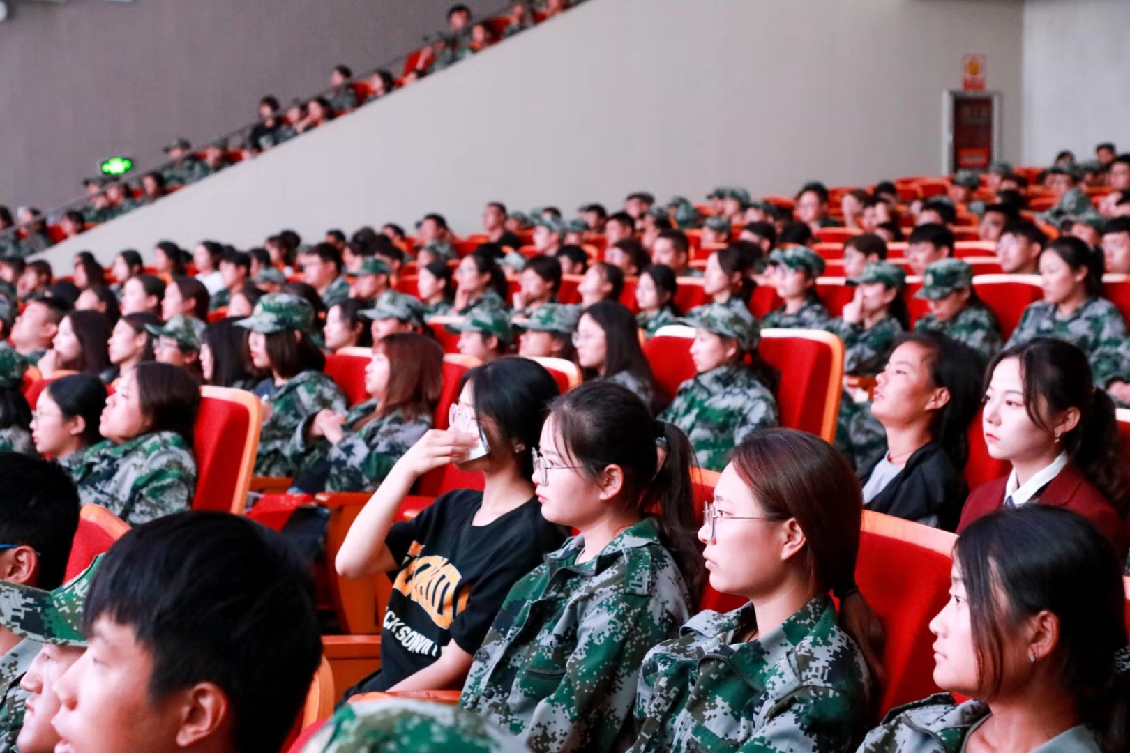 790余名新生在会堂一起观看了爱国纪录片《厉害了,我的国》,聆听全国优秀教育工作者、全国红色故事金牌讲解员李楠老师和胡鑫同学讲述的《人民的胜利》《太行奶娘》的革命故事。