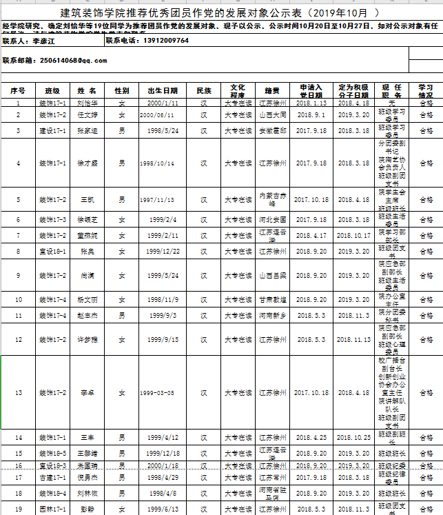 英国上市官网365推荐优秀团员作党的发展对象公示表(2019年10月 )