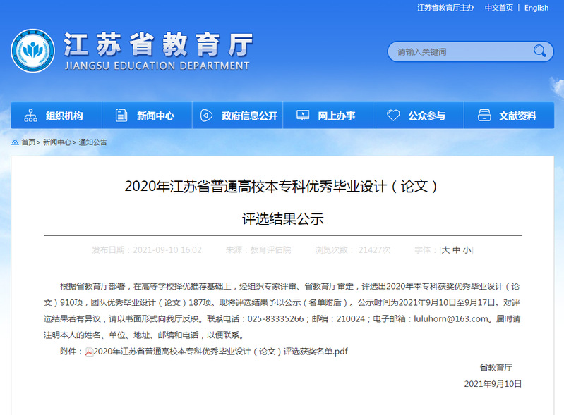 近日,江苏省教育厅公布了2020年江苏省普通高校本专科优秀毕业设计(论文)评选结果,公司报送的1项个人毕业设计和1项团队毕业设计全部榜上有名,共获优秀毕业设计个人三等奖1项,优秀团队毕业设计1项。
