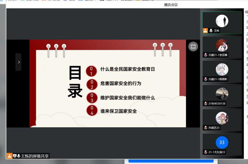 为深入贯彻落实习近平总书记提出的“总体国家安全观”,进一步增强员工的国家安全意识和抵御安全风险能力,培养和增强青年员工自觉维护国家安全的责任感、使命感。4月17日晚,公司组织开展了以“树立总体国家安全观 共筑国家安全人民防线”为主题的线上班会活动。