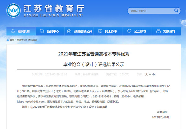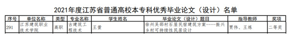 近日,2021年度江苏省普通高校本专科优秀毕业论文(设计)评选结果公示,公司贾伟老师、副经理王炼指导的古建19-2班王萱同学的毕业设计《徐州吴邵村石屋民宿建筑方案——振兴乡村可持续性民居设计》获得二等奖。