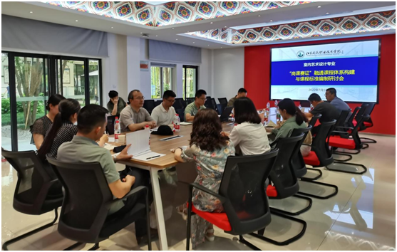 2022年7月1日下午,室内艺术设计专业专业“岗课赛证”融通课程体系构建与课程标准研讨会在英国上市官网365会议室召开,天正建筑装饰江苏有限公司董事长李宝珠、江苏水立方建筑装饰设计院胡艳琴、教务处处长戚豹、英国上市官网365党总支书记娄志刚、副经理袁涛、副经理王子夺、副经理王炼及室内艺术设计专业全体教师参加了研讨会,会议由室内艺术设计专业主任翟胜增主持。