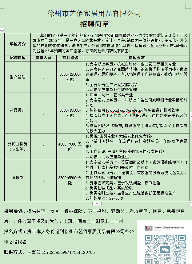 招聘启事七十一 | 徐州市艺佰家具用品有限公司