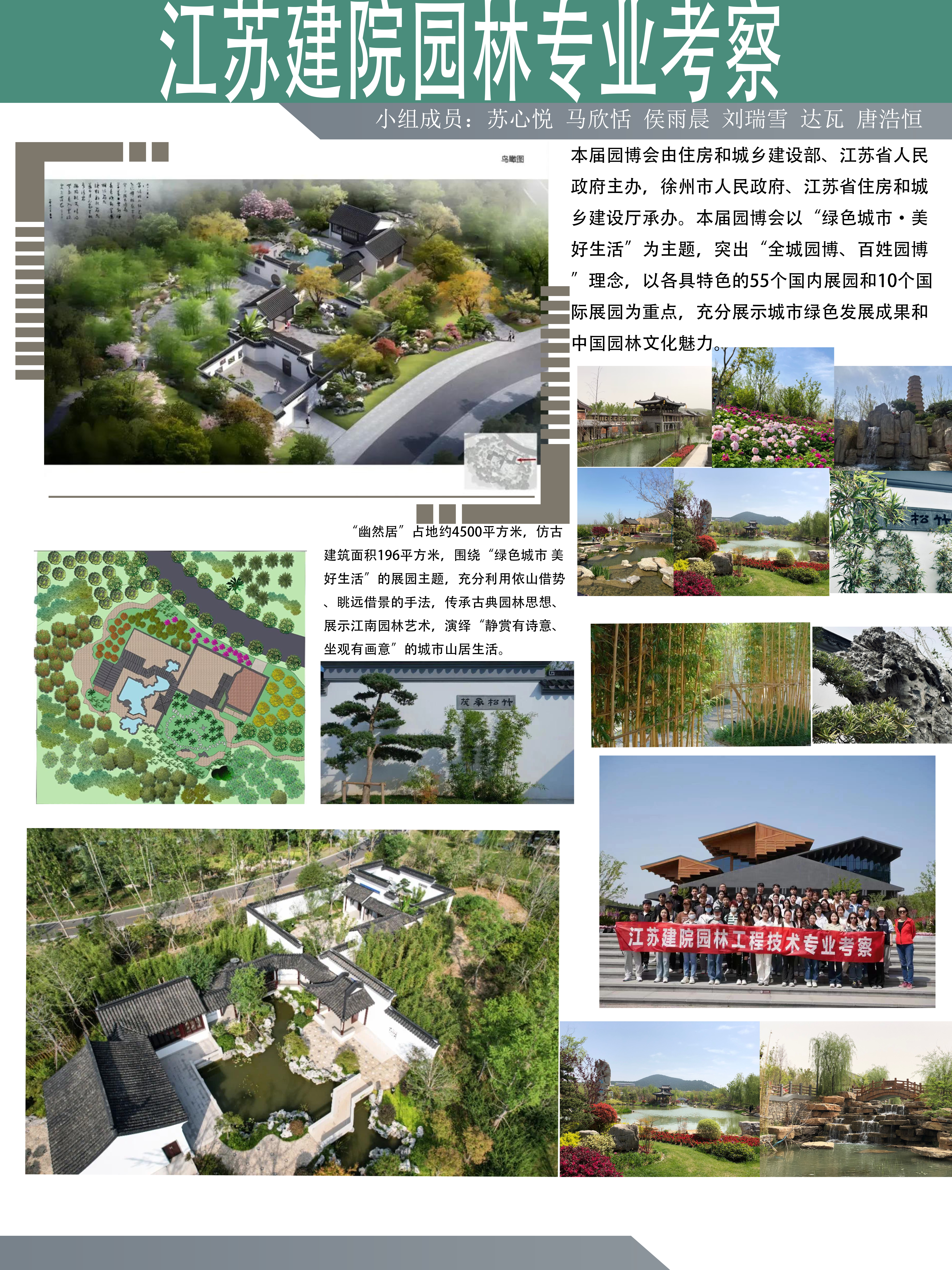 适逢第十三届中国国际园林博览会在徐州召开,专业考察期间,同学们沉浸式地实地考察了徐州园博园的整体规划,各展园的建筑、景观营造,植物识别及种植设计,同时,各小组选择一个展园进行了详细测绘,绘制完成了该展园的平面图、效果图,并对该展园进行了深入分析。