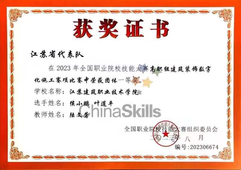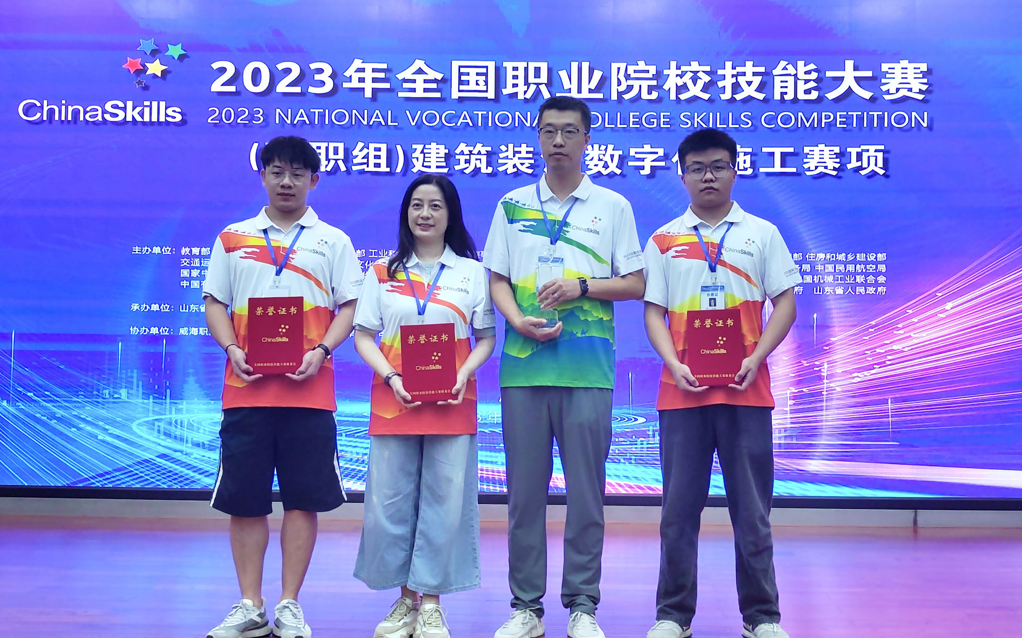 8月14日至17日,2023年全国职业院校技能大赛(高职组)建筑装饰数字化施工赛项在山东省威海职业公司举行。来自全国30个省、自治区、直辖市的59支代表队共计177名选手参加了大赛。公司由英国上市官网365陆文莺老师、装饰20-1班叶道平、室设20-1班侯小鹏组成的建筑装饰数字化施工赛项参赛队伍作为江苏省代表队之一,荣获本次国赛一等奖。