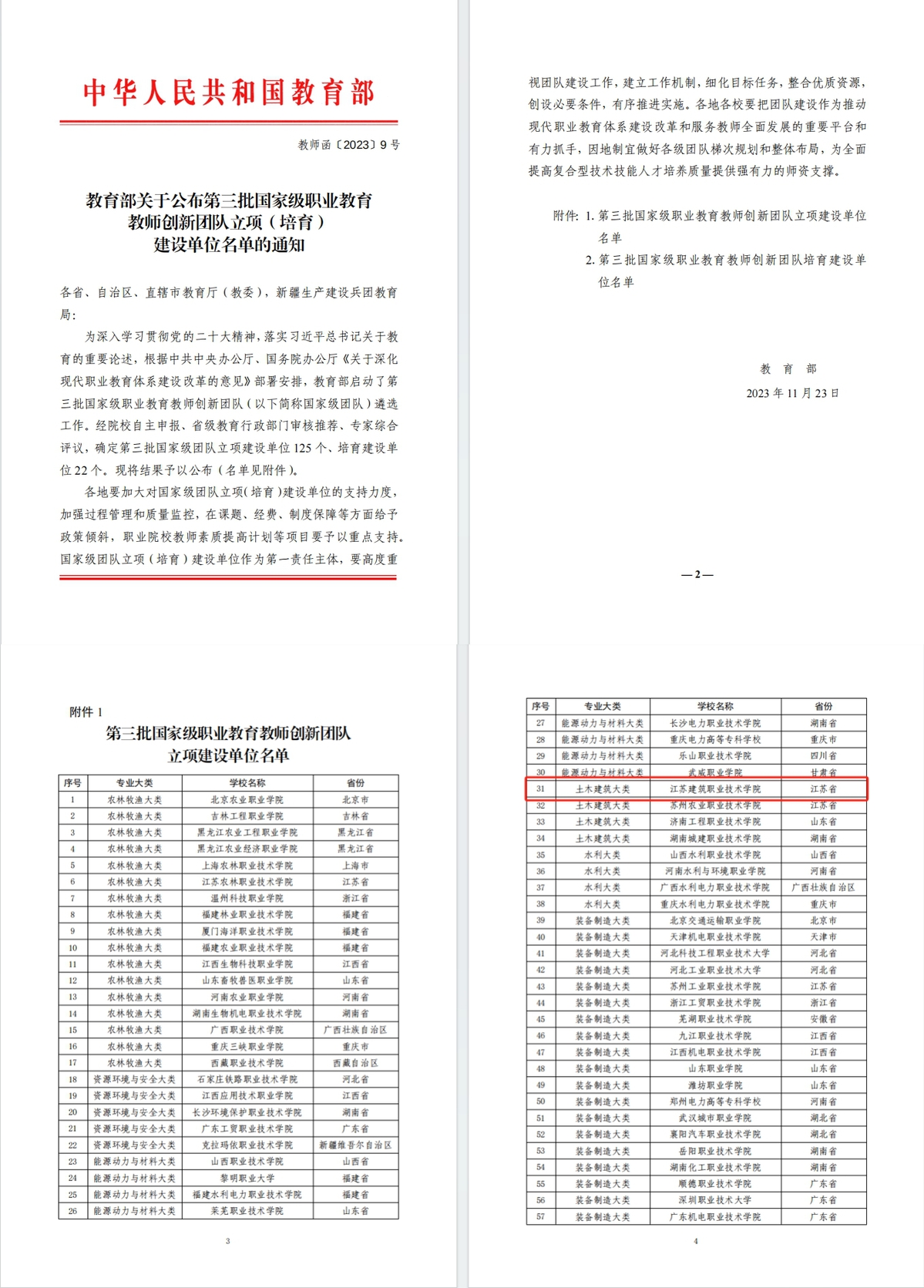 据悉,此次共确定国家级职业教育教师创新团队立项建设单位125个,其中土木建筑大类有4所高职院校入选。