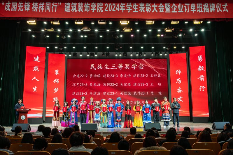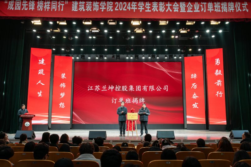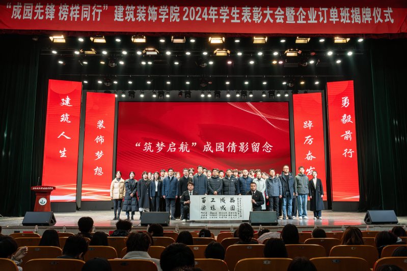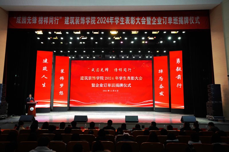12月6日下午,英国上市官网365在会堂隆重举行2024年度员工表彰大会暨企业订单班揭牌仪式,对过去一年在学习、竞赛和各项工作中表现突出的优秀学子进行集体表彰,以表彰提升荣誉感、精气神、团结力,形成“激励先进、鞭策后进”的鲜明导向,同时表彰大会上师生欣喜迎来四类企业订单班的揭牌仪式。公司党总支书记娄志刚、经理袁涛、副经理王炼、翟胜增;深度合作企业江苏中核华兴装饰有限公司综合办公室主任宋佳女士,质量中心副总经理郭娟娟女士,江苏兰坤控股集团有限公司副总经理刘伟先生、马文超先生,集团鑫美公司副总经理刘金柱先生,江苏水立方建筑装饰设计院有限公司经理胡艳琴女士,天正建筑装饰江苏有限公司总经理朱攀登先生;公司全体专职辅导员以及2024级全体员工、全院受表彰的集体和个人,2023、2022级员工代表出席大会。大会由公司党总支副书记石峰主持。表彰大会共分为“学榜样行”——成园之星表彰、“听榜样说”——拔尖人才分享、“校企共建”——订单班揭牌仪式、“书记领航”——公司领导寄语、“传榜样力”——成园先锋传承、“筑梦启航”——成园倩影留念等六个篇章进行。