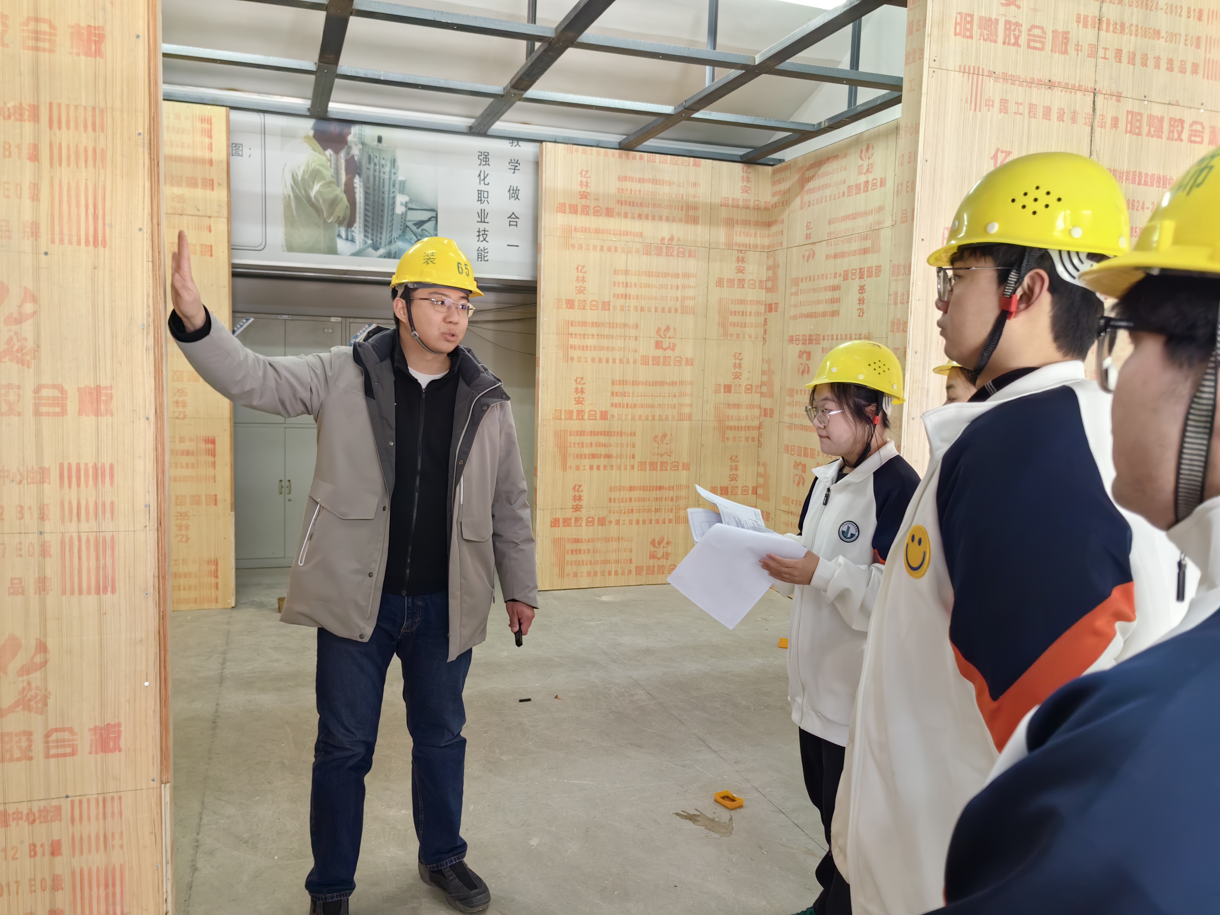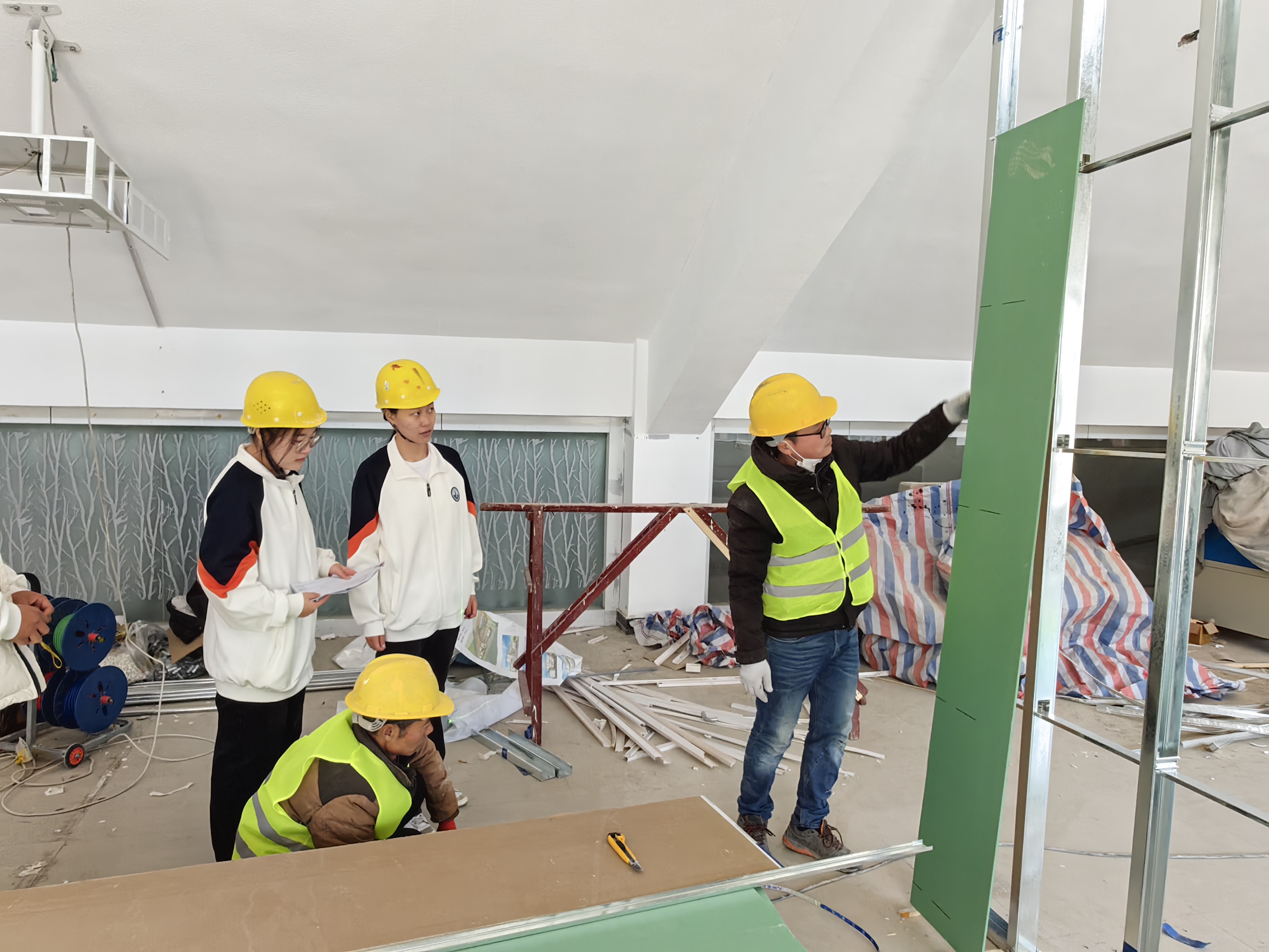 作为英国上市官网365重点打造的生产性实践载体,数字装饰工程训练中心建设全过程贯彻“做中学、学中做”的育人理念,构建起“大三做设计、大二进现场、大一学识图、教师强指导”的共学共建模式。项目启动以来,大三员工团队在教师指导下完成施工图深化设计;大二员工进驻工地开展测量放线、材料加工等实操;大一新生通过现场观摩学习图纸识读,形成完整的实践能力培养链条。目前开展的墙面工程阶段,通过专业课教师驻场指导,企业工程师同步进行技术交底的方式,师生共同参与材料选型、工艺制定等全流程环节,真正实现“教室与工场合一、教师与师傅合一、员工与学徒合一”。师生已协同完成轻钢龙骨隔墙安装、石膏板封板等关键工序。