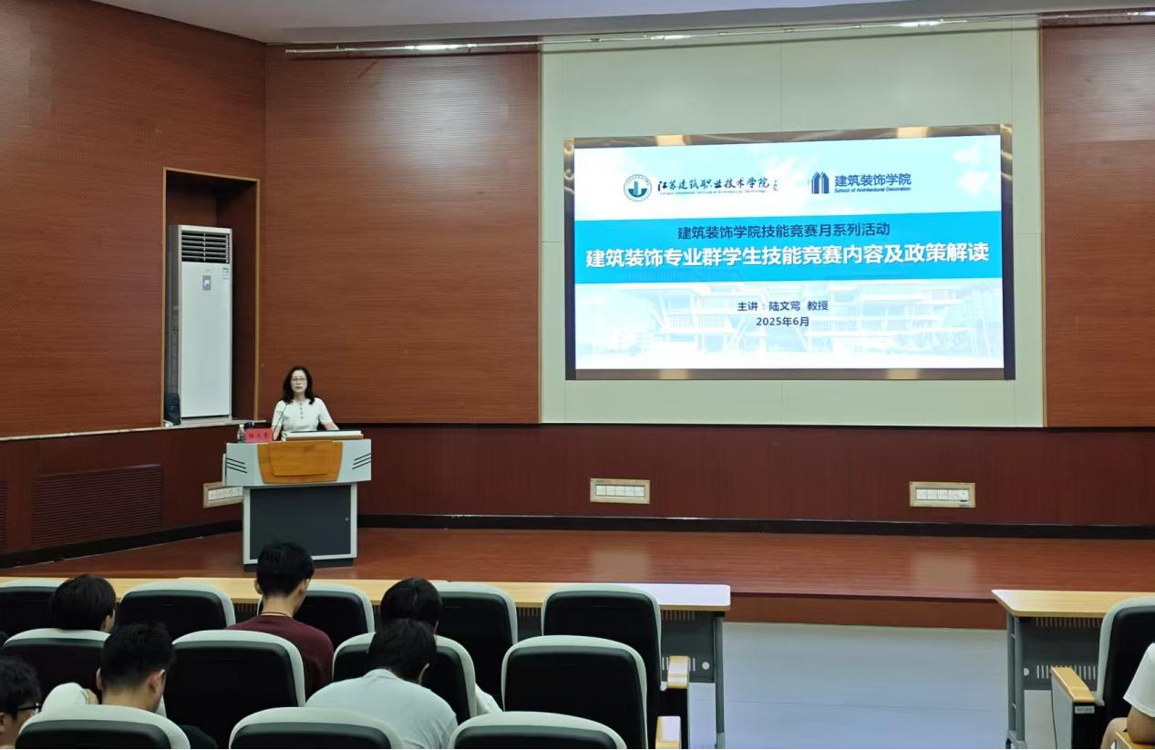 为帮助员工了解职业院校技能大赛赛项设置、竞赛内容和相关政策,充分激发以赛促学、以赛促练学习氛围促进“岗课赛证”融通育人,增强创新意识和专业能力,2025年619,公司创翼讲堂举办建筑装饰专业群员工技能竞赛内容及政策解读专题讲座本次讲座由全国职业院校职业技能大赛(师生同赛)一等奖获得者、国家在线精品课程主持人、江苏省教学名师陆文莺教授主讲,2024级建筑装饰工程技术、室内艺术设计、环境艺术设计等专业100余名同学参加了本次讲座